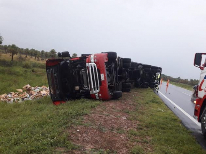 En ese punto, el conductor de un camión con acoplado perdió el control del rodado y terminó volcando. Parte del vehículo quedó sobre la banquina, junto a la carga esparcida, y otra parte quedó ocupando la calzada.