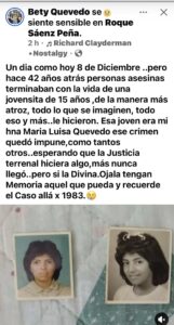 Hoy, a 42 años del femicidio, María Luisa Quevedo sigue siendo una deuda pendiente. Su caso habla de una época, de un sistema y de una sociedad que en muchos momentos eligió callar. Y también habla de una familia que, pese a todo, continúa reclamando verdad y memoria.