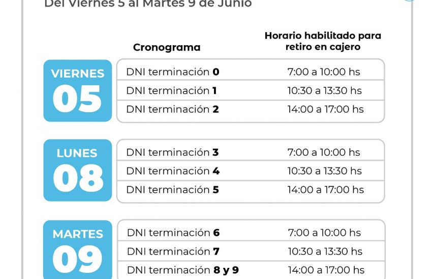 El cronograma continuará el día miércoles 3 de junio con el pago de haberes para los trabajadores pasivos cuyos DNI terminen en 3, 4 y 5. Todos aquellos con DNI que finalicen con 3, el horario habilitado para retiro por cajero será de 7:00 a las 10:00; aquellos con DNI finalizados en 4, el horario habilitado es de 10:30 a 13:30 y aquellos con los DNI terminados en 5, el horario será de 14:00 a 17:00.