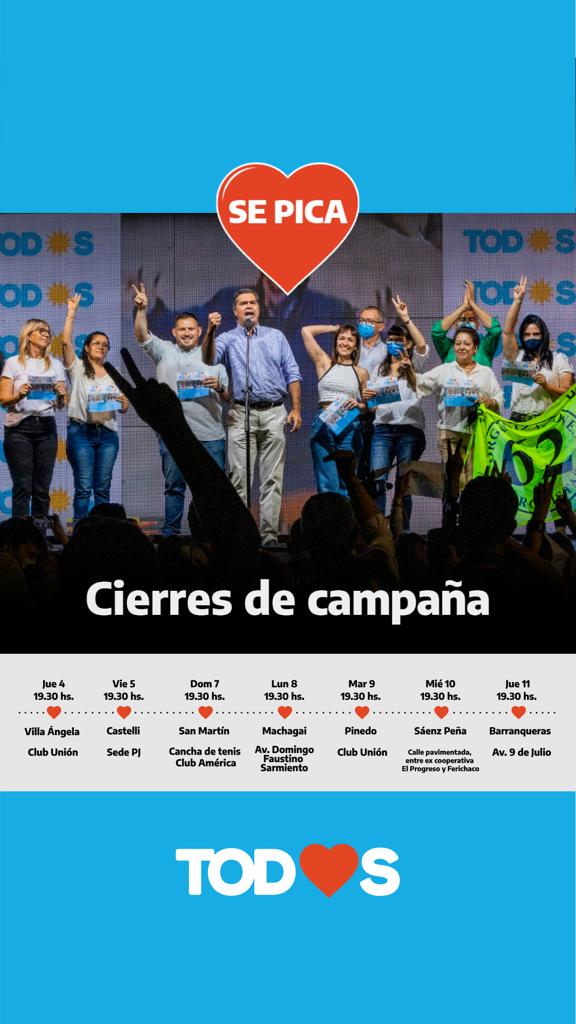 El gran cierre de campaña será este jueves 11 de noviembre en la localidad de Barranqueras. En cada oportunidad, el gobernador y las y los candidatos presentarán a la ciudadanía el modelo de provincia que buscarán fortalecer y donde se vivirá el acompañamiento y la mística militantes junto a referentes, simpatizantes y fuerzas que integran el Frente de Todos.