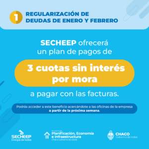 Para las facturas de enero y febrero, los usuarios podrán acceder a un financiamiento directo en la boleta, con un plan de pago de tres cuotas sin interés. Este trámite se realizará en las oficinas de la empresa Secheep.