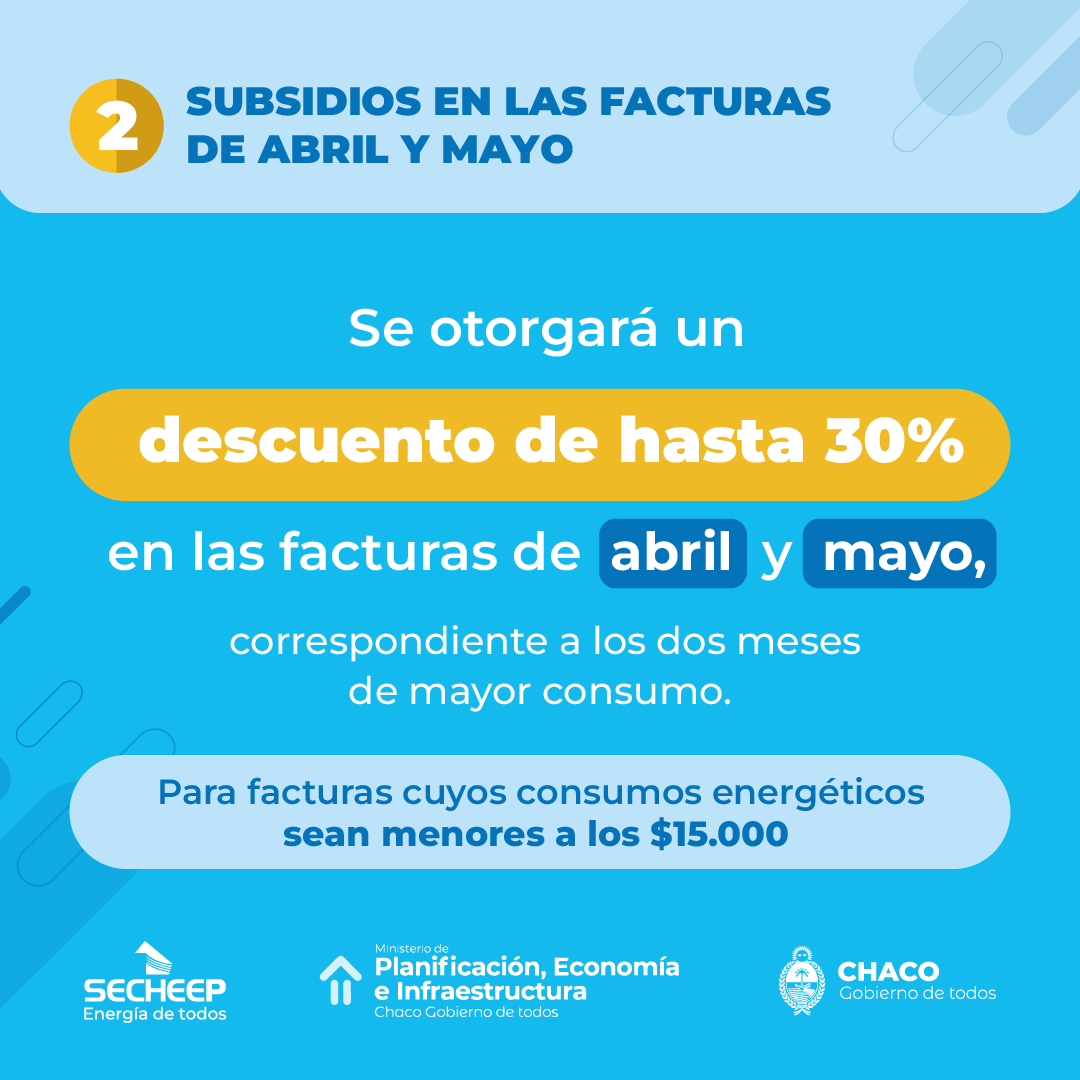 En las facturas de abril y mayo se otorgará un subsidio de $2.400 para usuarios cuyas facturas sean menores a $15.000, es decir, que en total recibirán un descuento de $4.800 por ambos meses. Este subsidio directo equivale a una bonificación del 30% de la tarifa para el 50% de los usuarios residenciales (bajos ingresos) y del 20% para el resto.