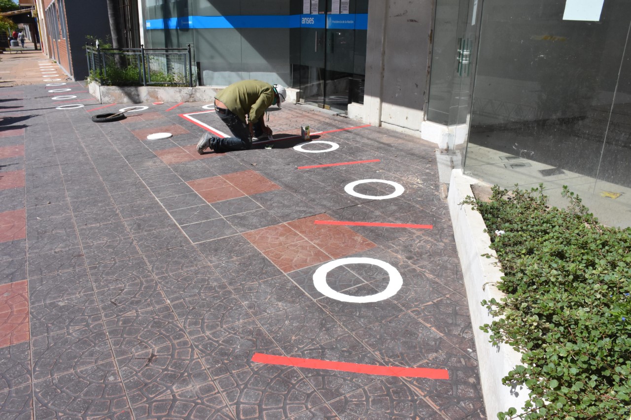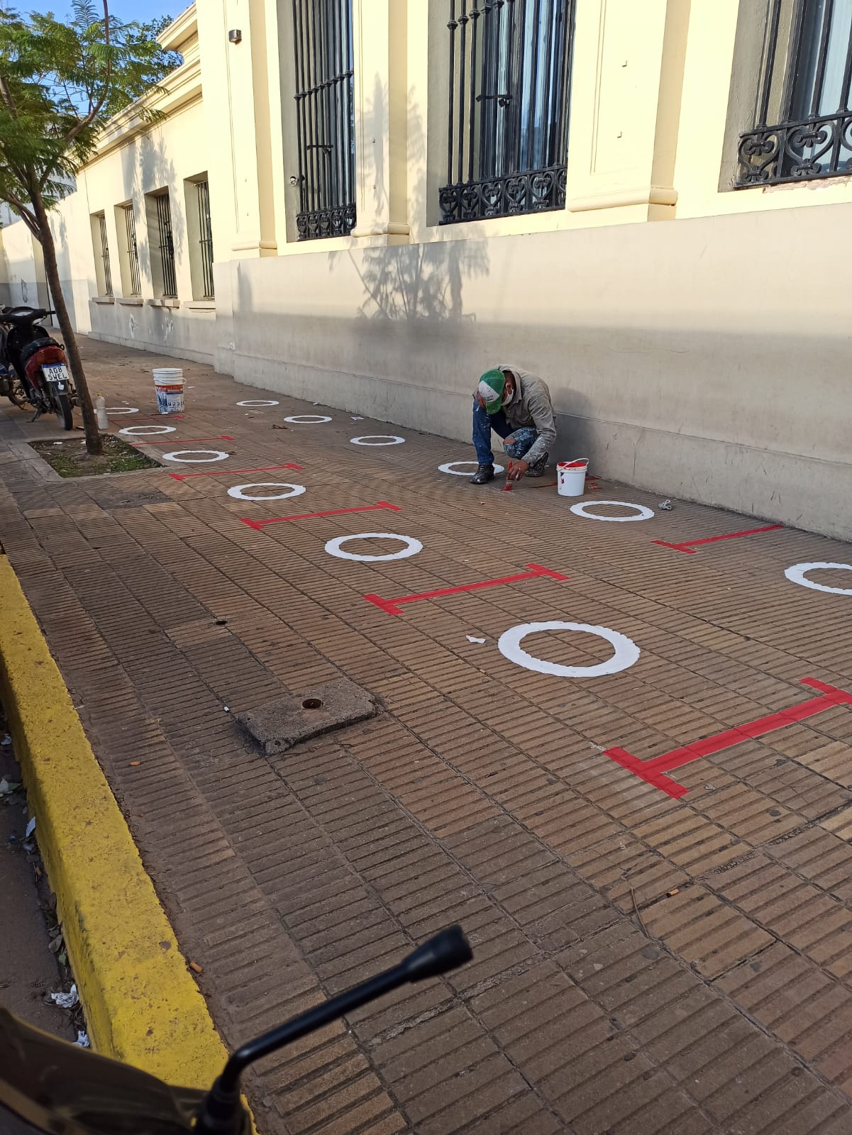 La Municipalidad de Sáenz Peña continúa con las acciones de prevención del COVID-19 y para evitar la concentración de personas, a través de la Secretaría de Servicios Públicos, continúa realizando la demarcación en las veredas de distintas instituciones y comercios de la ciudad.