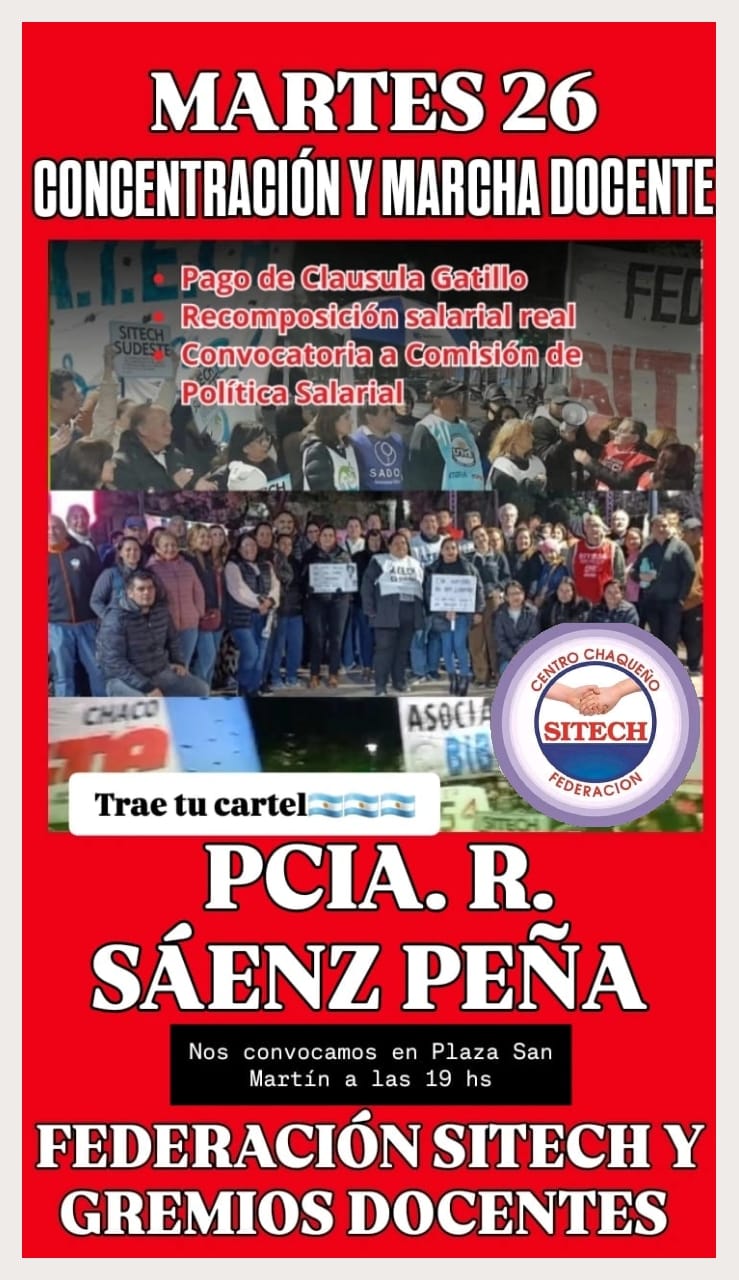 JORNADA DE LUCHA DOCENTE 26 DE AGOSTO, 19 HS. EN PLAZA SAN MARTÍN. PCIA. ROQUE SAÉNZ PEÑA 📢
