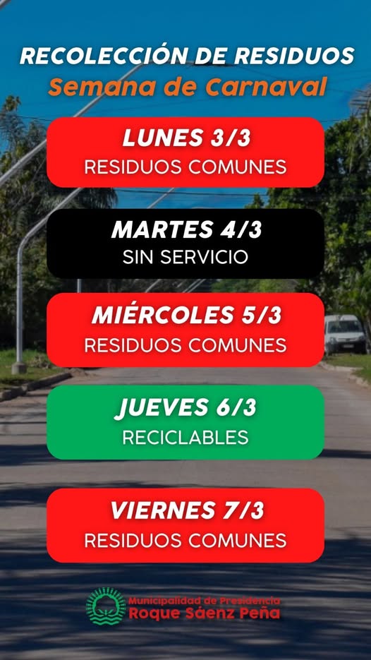 El municipio de Sáenz Peña recuerda que por los feriados nacionales de Carnaval, que se celebran el lunes 3 y martes 4 de marzo, el lunes 3 habrá recolección de residuos comunes , martes 4 NO HABRÁ RECOLECCIÓN