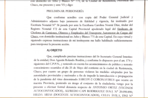 En la mañana de este jueves 27, la exposición judicial fue enviada y establece que fue presentada por el apoderado José Eduardo Rundio, por instrucciones del secretario general interino de la entidad Agustín Rolando Bordón. La manifestación realizada durante el día patrio que conmemora la Revolución de Mayo fue convocada a través de las redes sociales y se realizó en la tarde del martes 25, en el centro de la capital provincial.