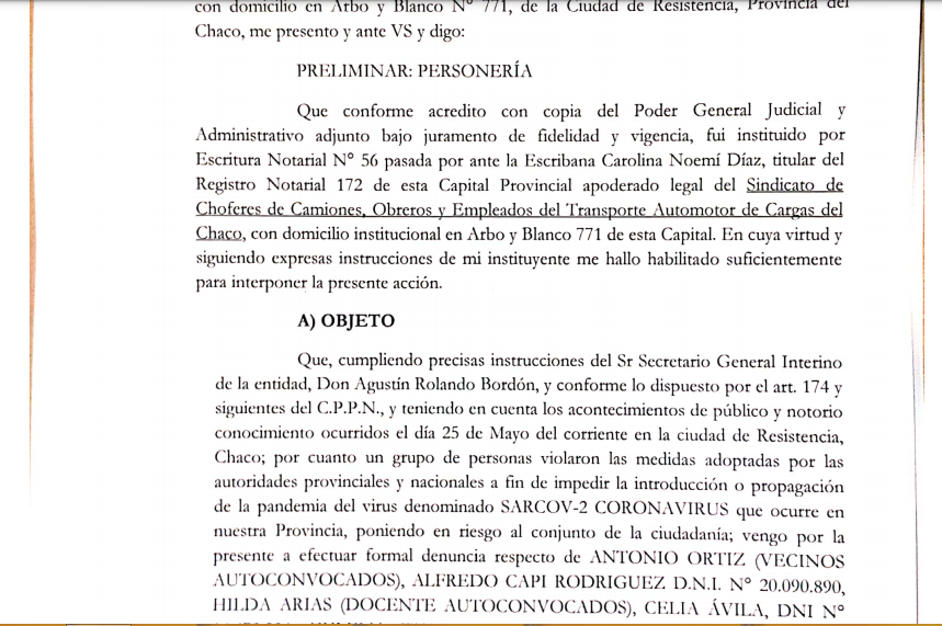 La conducción interina del Sindicato de Choferes de Camiones, Obreros y Empleados del Transporte Automotor de Carga del Chaco denunció penalmente ante la Justicia Federal a un grupo de personas que marcharon el pasado 25 de mayo en contra de las medidas de restricción decretadas por los gobiernos nacional y provincial con el objeto de mitigar el impacto de esta segunda ola de COVID-19. La denuncia presentada ante el Juzgado Federal de Resistencia recayó en la jueza Zunilda Niremperger, ya que durante este mes de mayo está de turno en esta jurisdicción; y guarda estrecha relación con hechos ocurridos en la ciudad de Rosario que derivaron en la imputación de varias personas y la aprehensión de un concejal breñense.