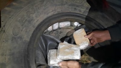 Luego, verificaron el rodado con la ayuda del can detector de narcótico, hallaron dentro de una cubierta varios envoltorios tipo panes con una sustancia verdosa. Asimismo continuando con la requisa observaron dentro de un bolso otros envoltorios con la misma sustancia.