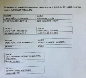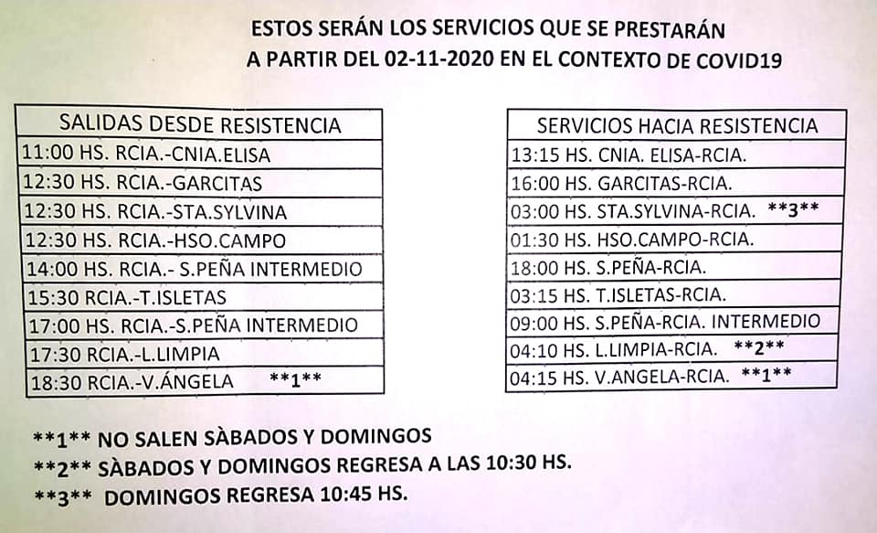 La frecuencia se ajustará a la demanda, pero no se podrá superar la frecuencia máxima habilitada para cada línea. Las empresas, podrán reprogramar los servicios cuando la venta no haga rentable la realización del viaje. Las unidades, podrán utilizarse con un límite del 60% de los pasajeros para cada horario. Sin bien la venta de pasajes podrá ser en ventanilla, se recomienda utilizar medios no presenciales.