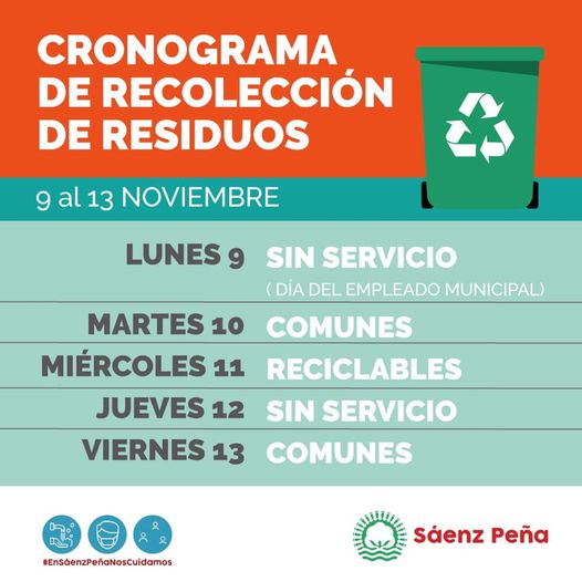 Sáenz Peña – La Municipalidad de Presidencia Roque Sáenz Peña, da a conocer el cronograma de recolección de residuos para la próxima semana, con dos días SIN SERVICIO. Esta modalidad duraría desde el día Lunes 9 de Noviembre hasta el Viernes 13 del mismo mes.