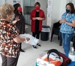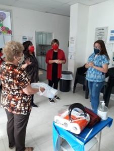 La concejal Marilin Rodríguez acompañada de su par Nora Gauna e integrantes del Grupo #barbijossolidarios hicieron entrega esta mañana de mascarillas, lavandina y otros elementos de limpieza para el Centro de Salud del barrio Monseñor de Carlo.