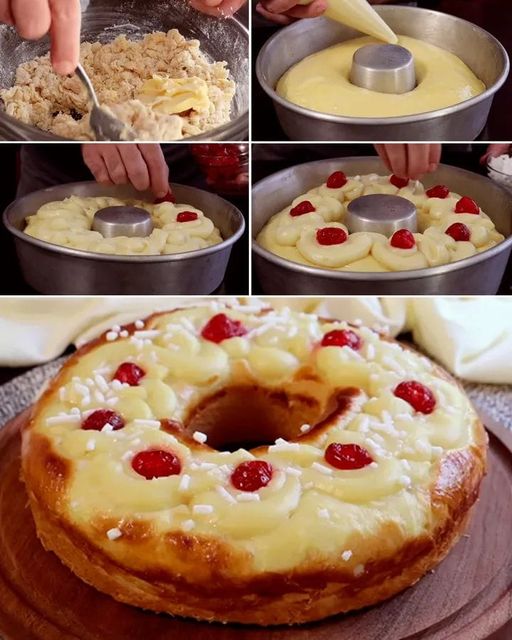 Luego decorar con Crema Pastelera, haciendo un zigzag todo alrededor de la rosca y completando los lugares donde se vea masa con más crema.