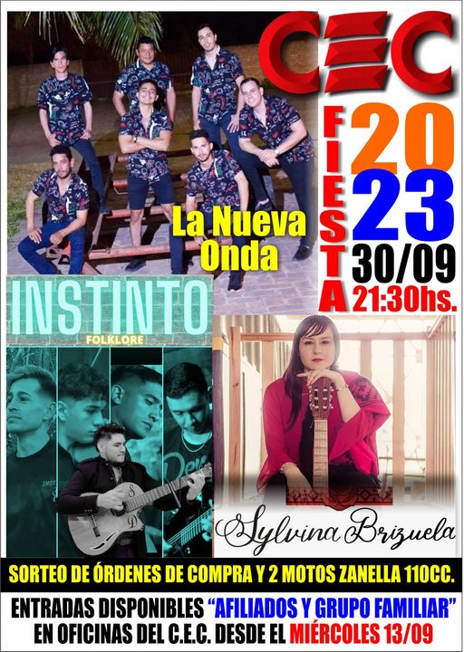 El Sábado 30 de septiembre desde las 21.30 hs, el CEC prepara nuevamente de una noche inolvidable, el mismo se llevará a cabo en el camping del CEC en barrio villa San José , con la presentación de 3 bandas de nuestra ciudad, sorteo de órdenes de compra y 2 MOTOS Zanella ZB 110 cc.