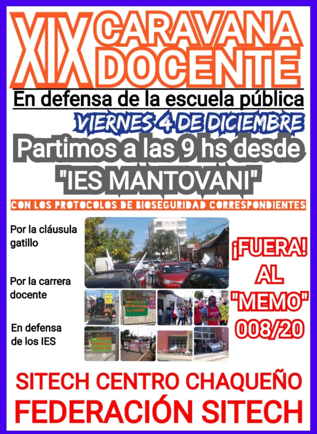 Organizado por Sitech Centrochaqueño adherido a Federación Sitech, la caravana docente convoca a docentes y otros sectores a participar, con todos los protocolos de bioseguridad correspondientes. Se partirá de «IES MANTOVANI».